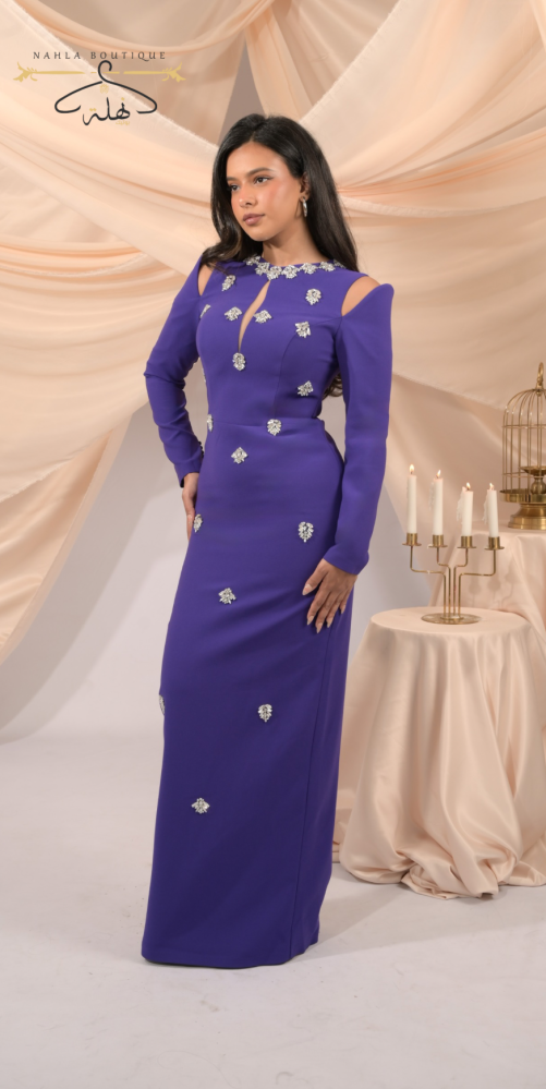 فستان سهرة أنيق باللون البنفسجي ، يتميز بقصة طويلة مستقيمة تبرز أنوثة القوام برقي ، تزين الفستان تطريزات فاخرة مرصعة بأحجار لامعة موزعة ، مع تصميم مبتكر للأكتاف يمنح طابع أنيق ، يأتي الفستان بلمسات مدروسة تجمع بين الفخامة الكلاسيكية ، ليمنح حضورًا مميزًا.