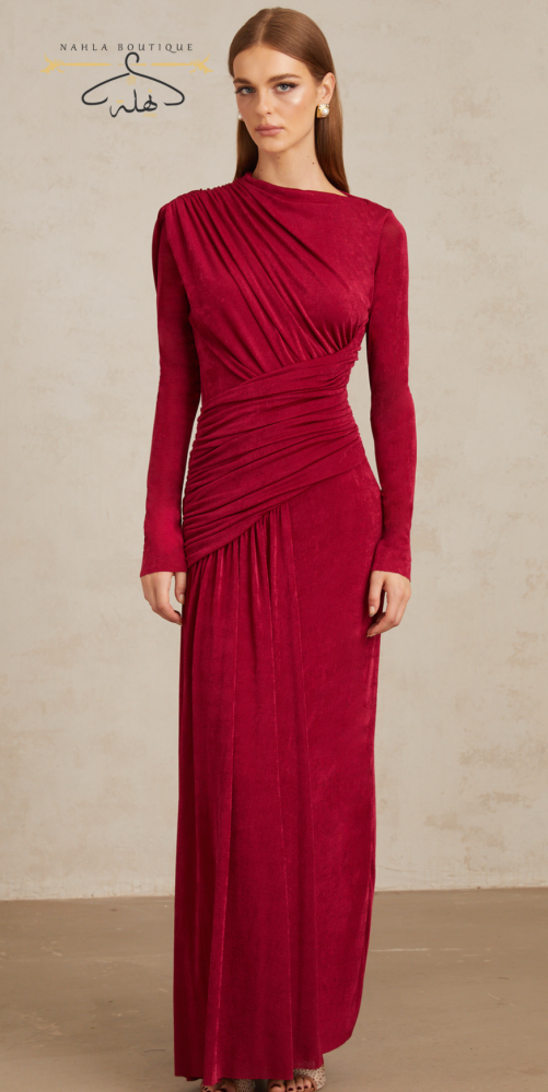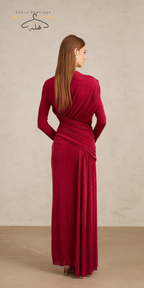 الفستان أحمر أنيق وطويل ، يتميز بقصة ضيّقة تبرز القوام بشكل راقٍ وأنثوي ، التصميم ملتف عند الخصر بطريقة درابيه أنيقة تُضفي لمسة فاخرة، مع أكمام طويلة وياقة مرتفعة تضيف لمسة من الرقي.