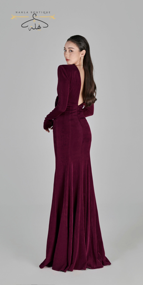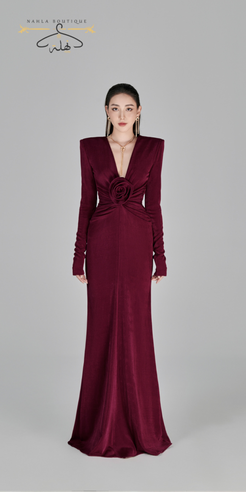 فستان سهرة برغندي طويل بأكمام ضيقة وتصميم كتف بارز ، بفتحة صدر على شكل V ووردة بارزة عند الخصر تمنحه لمسة فخمة وأنيقة.
