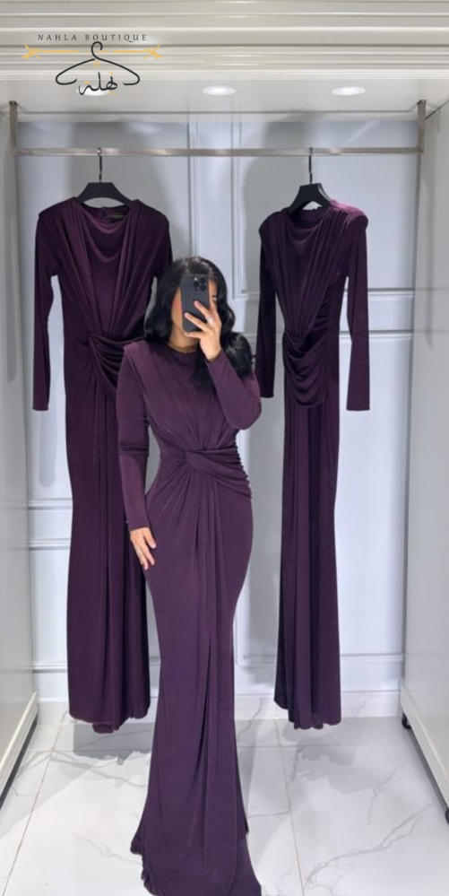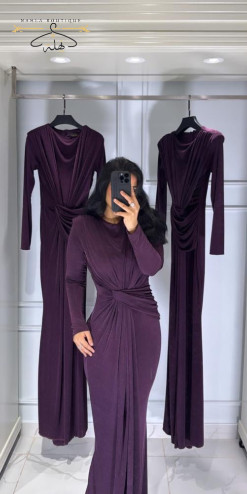 فستان سهرة أنيق باللون البنفسجي بخامة استرتش ، يتميز بقصة طويلة وانسيابية تبرز جمال القوام بأنوثة راقية ، صُمم الفستان بياقة عالية وأكمام طويلة ، ليجمع بين الطابع الكلاسيكي والمظهر الأنيق ، يزين الخصر بتفاصيل درابيه أنيقة تنسدل بانسيابية ، مضيفة لمسة فخمة ومميزة على التصميم.