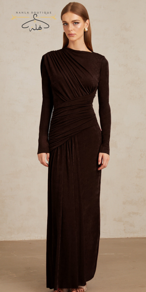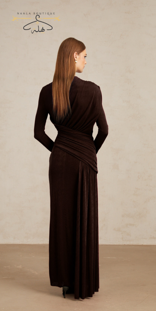 الفستان بني أنيق وطويل ، يتميز بقصة ضيّقة تبرز القوام بشكل راقٍ وأنثوي ، التصميم ملتف عند الخصر بطريقة درابيه أنيقة تُضفي لمسة فاخرة، مع أكمام طويلة وياقة مرتفعة تضيف لمسة من الرقي.