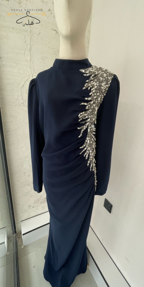 فستان أنيق وفخم باللون الكحلي يتميز بقصة ضيقة تبرز جمال القوام مع أكمام طويلة وياقة مرتفعة التصميم مزين بتطريز فاخر من الكريستال يمتد بشكل مائل من الكتف إلى الخصر مما يمنحه لمسة أنيقة وعصرية القماش ناعم وانسيابي مع قصة طويلة تضيف لمسة من الفخامة مناسب للسهرات والمناسبات الراقيه.