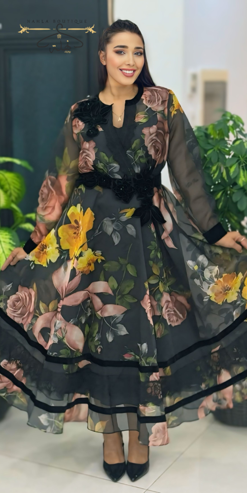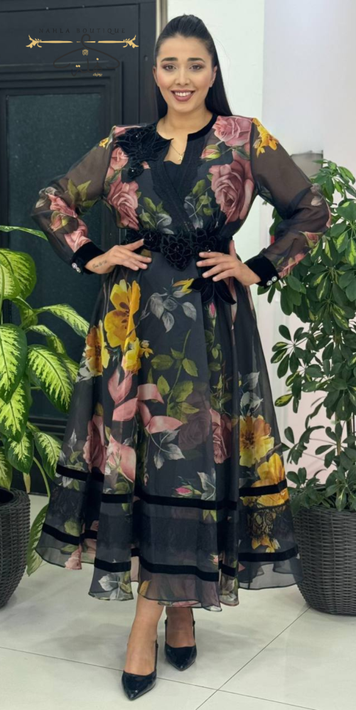 فستان أسود مزهر بأكمام شفافة وتطريز وردي على الخصر والياقة ، بطول ميدي وانسيابية أنيقة تناسب المناسبات الراقية.