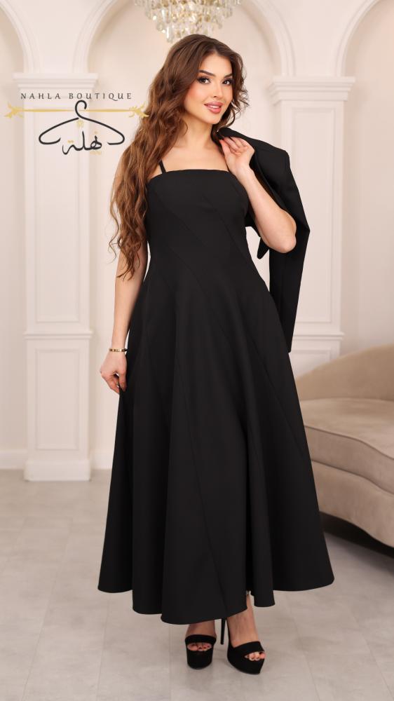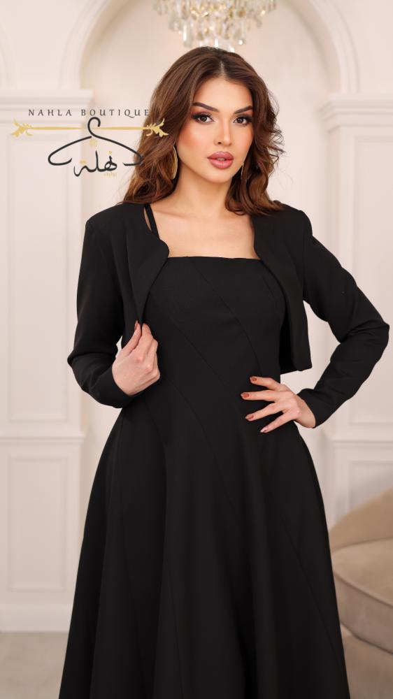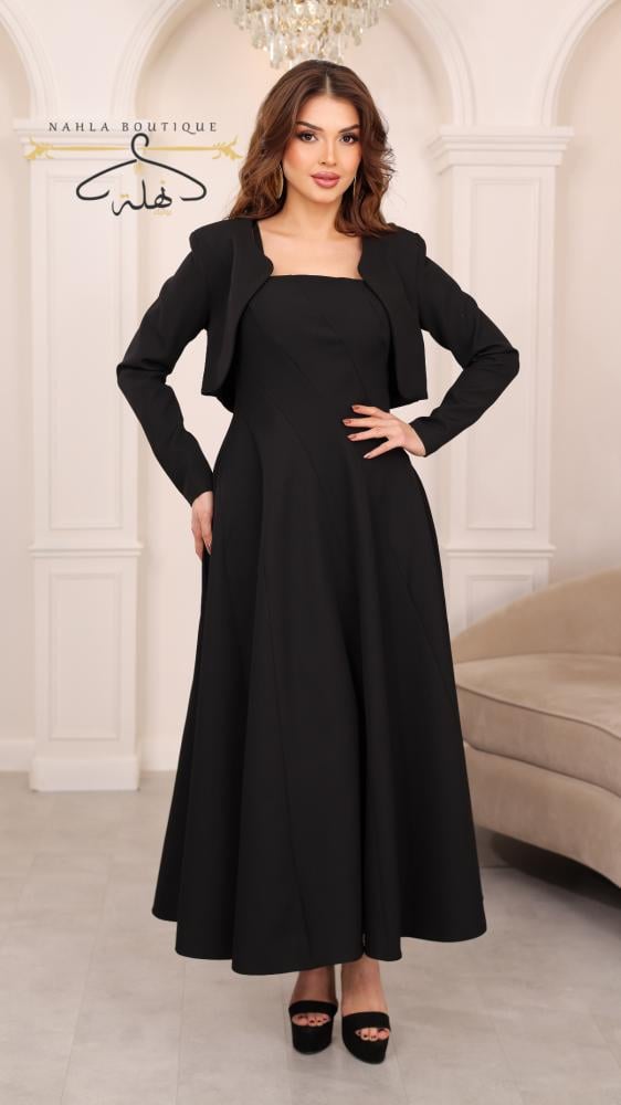 فستان ميدي أسود بقصة واسعة وانسيابية، يتميز بياقة مربعة وتصميم ناعم يبرز الأنوثة بأناقة مزود بجاكيت قصير بأكمام طويلة يضيف لمسة راقية وعصرية خامة مريحة بانسدال جميل.