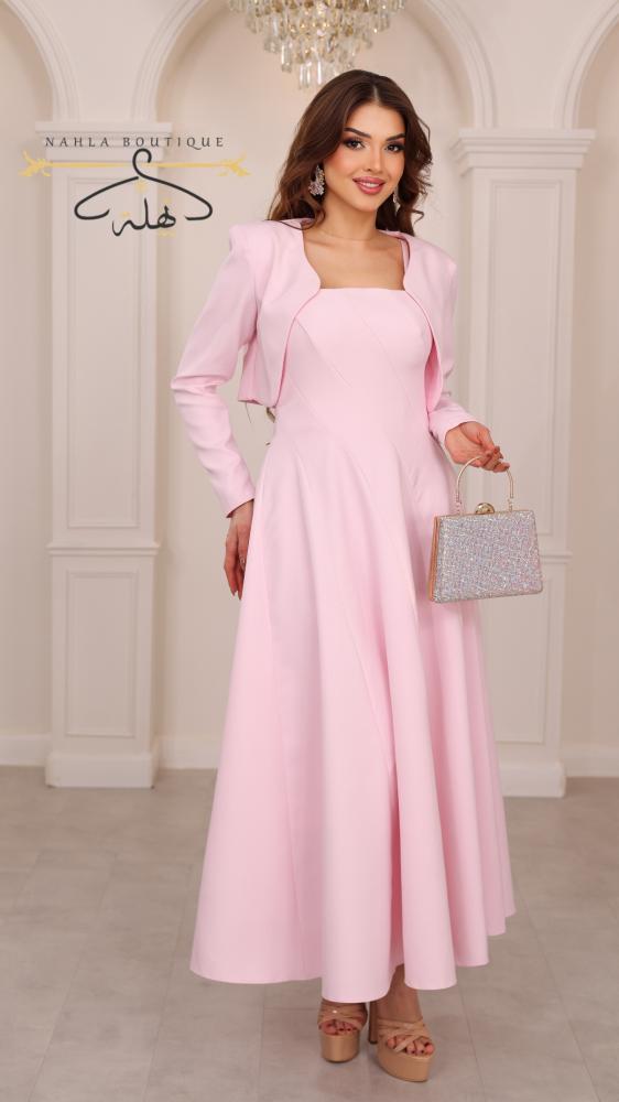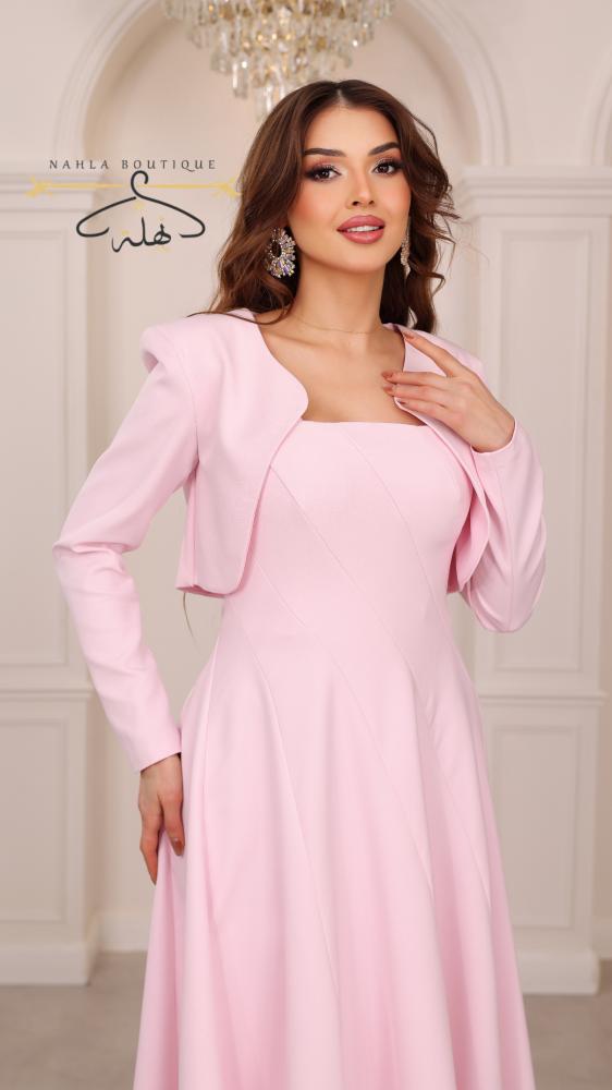 فستان ميدي وردي ناعم بقصة واسعة وانسيابية، يتميز بياقة مربعة وتصميم ناعم يبرز الأنوثة بأناقة مزود بجاكيت قصير بأكمام طويلة يضيف لمسة راقية وعصرية خامة مريحة بانسدال جميل.
