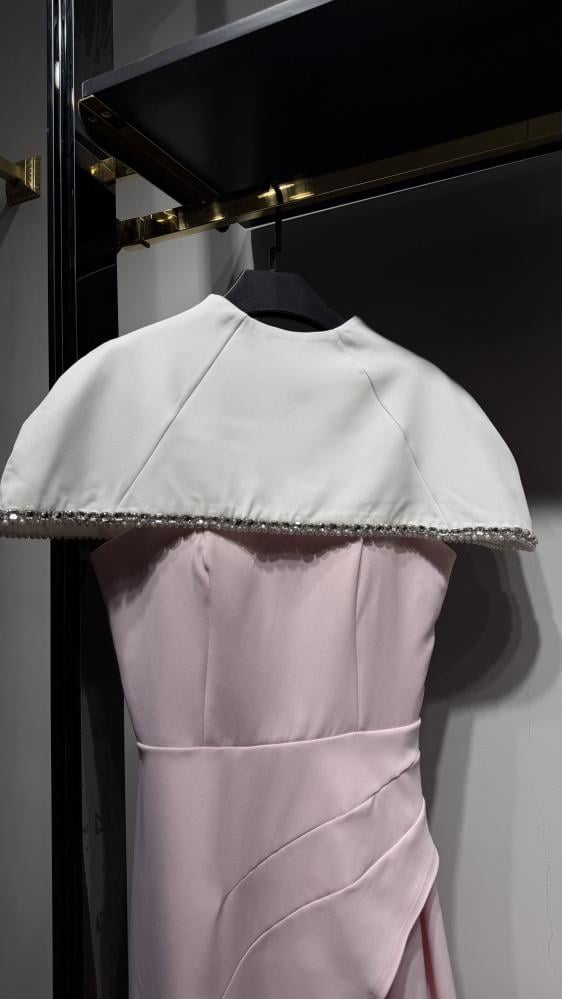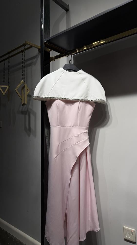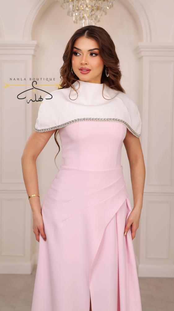 فستان وردي باستيل أنيق بقصّة انسيابية يبرز الخصر، مزوّد بكاب أبيض قصير مطرّز بحواف خرز لامعة، بطول ميدي ولمسة ناعمة راقية