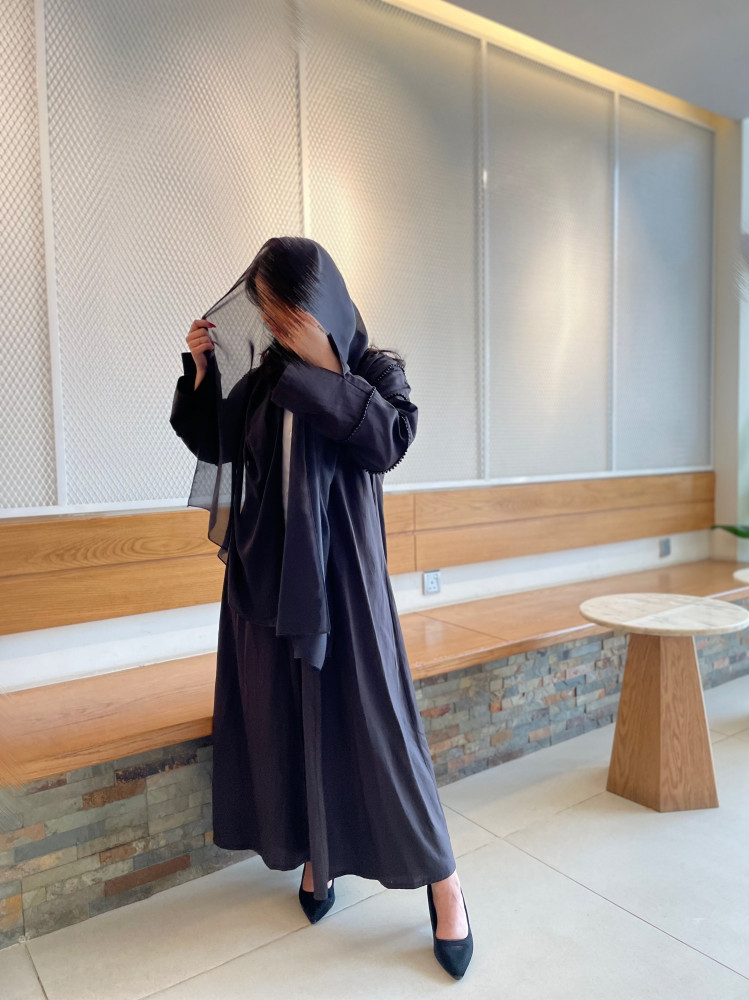 عبايه بقماش رمادي، قطن ،لولو اسود على الاكمام تصميم نص كلوش